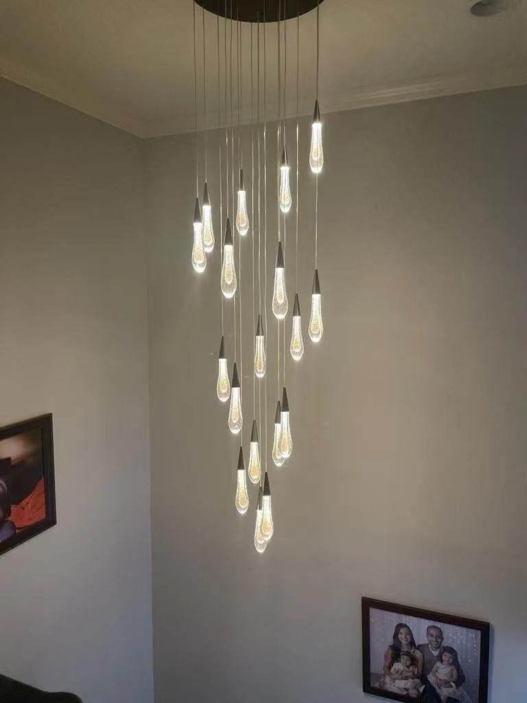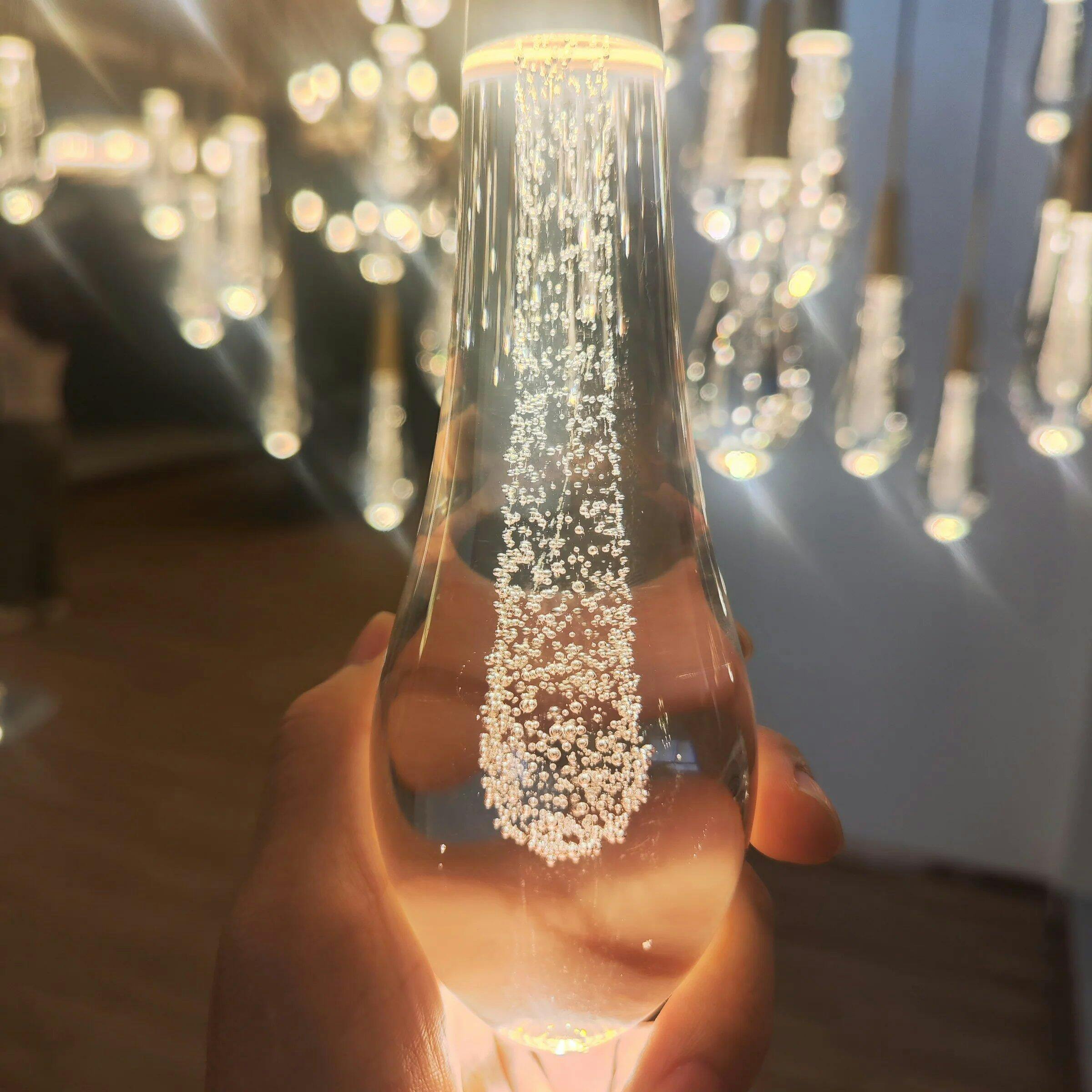Featuring adjustable black PVC cords cascading into integrated LED lights handcrafted from seeded glass, our Soltaire Lighting Collection mimics the look of a fallen raindrop