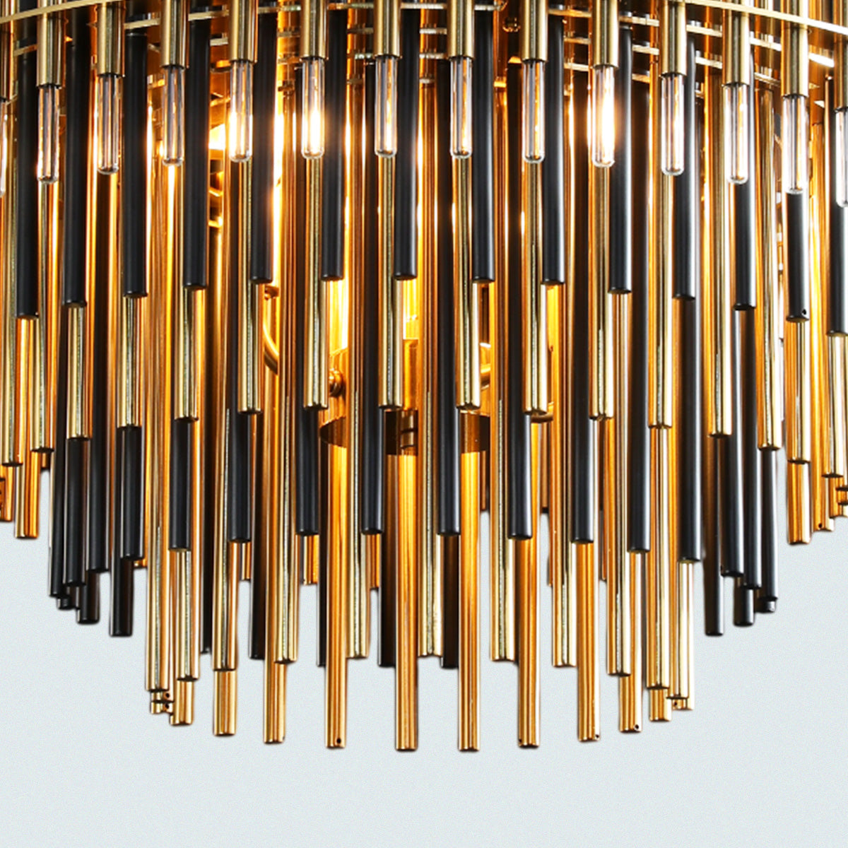 This chandelier draws inspiration from Art Deco design, blending geometric precision with bold luxury. Crafted from alternating black, gold, and silver-tone metal rods, the fixture creates a dramatic, layered visual effect. Equipped with 8 E14 bulb holders, it provides warm, ambient lighting ideal for dining rooms, foyers, or luxury living areas. Its sculptural form and modern elegance make it a statement centerpiece in contemporary interiors.